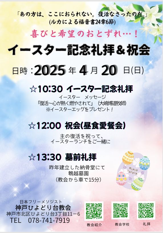 2025年4月3日 / 最終更新日時 : 2025年4月3日 永原 郁子 お知らせ イースターチラシ 今年のイースターは4月20日、教会員向けのチラシ作成の依頼があり、早速作って入稿しました。昨年完成した納骨堂の前で墓前礼拝をします。 本日の聖書 FacebookXBlueskyHatenaPocketCopy